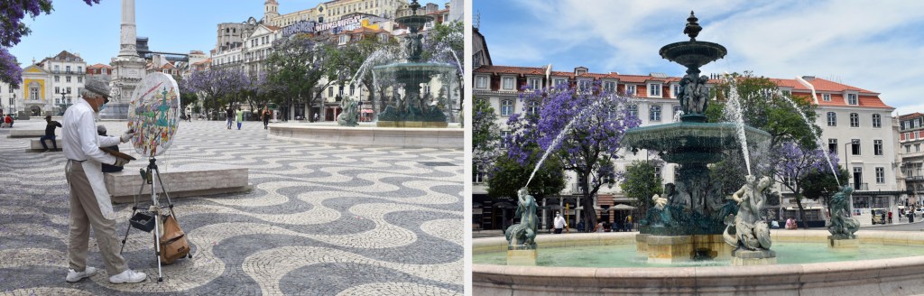 Surrounded by a multitude of shops, cafes, and restaurants, Rossio Square is one of our favorite places in Lisbon to grab a drink and people watch. It’s particularly stunning in June when all the jacaranda trees are in full purple bloom. The square also boosts 2 large fountains, each one consisting of 4 mermaids holding conch shells. The bronze sculptures were created by sculptors Mathurin Moreau and Michel Lienard and were installed with the fountains in 1889. They were created in Val d’Osne, France and then imported to Portugal. The rich seafaring history of Portugal is depicted in the emblematic pattern of the square’s pavement, Mar Largo (large sea), which simulates unstable waves.