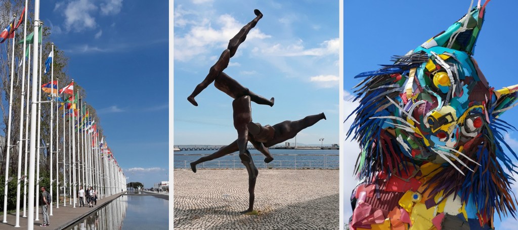 Continuing towards the waterfront you’ll find a reflecting pool flanked by flags, which represent the countries that participated in Expo ’98. It’s especially beautiful on a sunny day when all the colorful flags are reflected in the pool. The iron sculpture Rhizome by English artist Antony Gormley stands out against the sky. The piece consists of nine life-size human figures that symbolize the union between men and resembles the branches of a tree. My favorite piece in the park is the large and colorful Iberian Lynx created by the Portuguese artist Bordalo II. Made entirely of trash (mainly plastic) the work is part of his Big Trash Animals series. There are currently 195 Big Trash Animals, spread all over the world. Bordalo uses garbage, the same material that kills them, to provoke a different look at our consumerist habits. Very thought provoking.