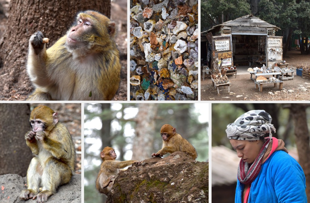 The best spot for viewing the Barbary Macaques is at the picnic area inside the forest. Here you’ll find vendors in wooden stalls selling fossils, minerals, honey, and hand-made crafts. You can also buy bags of peanuts and bananas to feed the monkeys. Barbary Macaques are omnivorous, and they have a varied diet consisting of plants, fruits, seeds, fungi, invertebrates, lizards, and agricultural crops. As we saw, they’ll come right up to humans for a tasty snack. Once widespread in parts of Europe and North Africa, from Egypt to Morocco, Barbary Macaques are now only found in fragmented areas of the Rif and the Middle and High Atlas Mountains in Morocco and parts of the Tellian Atlas in Algeria. A small population also lives on the Upper Rock of Gibraltar.