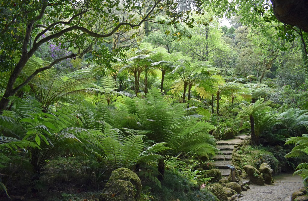After touring the palace interior, we began our walk through the park in Fern Valley. Noted for its collection of arboreal ferns from Australia and New Zealand, the fern trees were intentionally planted in a northwest facing valley to take advantage of the moist winds from the coast. Even though it was a sunny day, the valley was shady and cool. After Fern Valley, the path winds past Beckford’s Waterfall and a small lake before reaching a stone chapel.