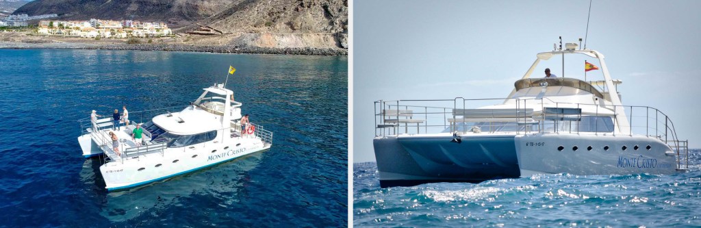 To celebrate Rick’s birthday, I booked a 3-hour whale watching tour on a catamaran. The forecast called for rain and as we walked down to the marina, dark clouds hung over the mountains. Luckily, they stayed put and we had sunshine and puffy white clouds during our trip. There were twenty guests onboard of various ages and nationalities plus the captain and a deckhand. Rick and I joined the captain on the top deck and were the only passengers, so it felt like a private tour. The captain mentioned that our seats were the most unstable on the boat and boy he sure wasn’t kidding! Once we left the marina and reached full speed, it felt like we were riding a roller coaster. Fortunately, neither of us get seasick so we enjoyed the ride and the amazing views. He told us we’d be going out 3 miles (4.83 kilometers) to find the best spot for seeing whales.