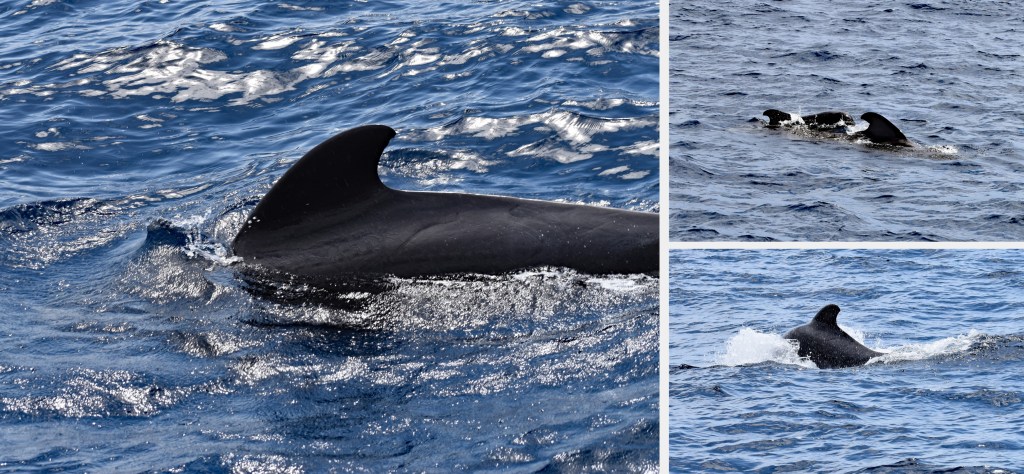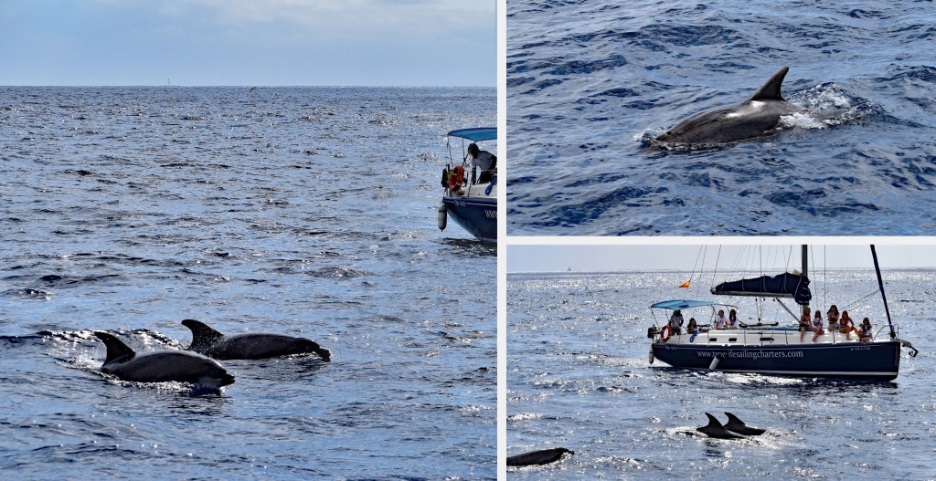 Once the captain spotted a pod of whales, he slowed the engine and told everyone to start looking off the bow of the boat. There were several other boats nearby, all with their engines off to not disturb the whales. It was magical seeing them emerge from the water so close to our boat. The captain told us that these are Short-Finned Pilot whales and that they are the second largest dolphin species behind the Orca or Killer whale. They range in size from 13 to 20 feet (4 to 6 meters) long and can dive to depths of 2,300 feet (700 meters) looking for their favorite prey, squid. The Pilot whales of Tenerife live in matriarchal pods of between 10 to 30 members and we were thrilled to spot a mother and her baby. We spent about 20 minutes watching the whales before heading off towards a sheltered cove. I was very impressed by the care shown to the whales by all the tour boats in the area. Only a handful of boats got close to them and once we left, another boat moved in to take our place.