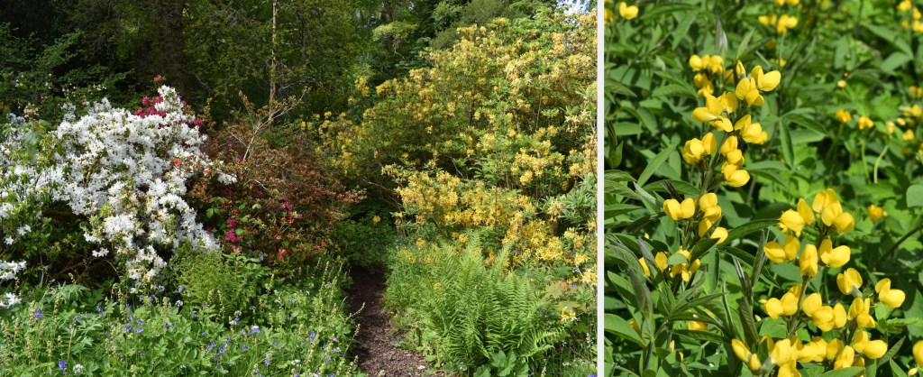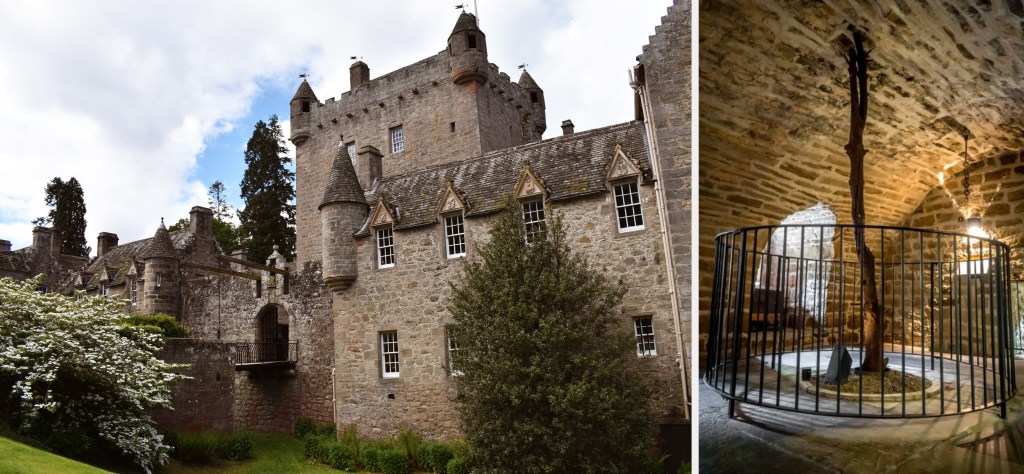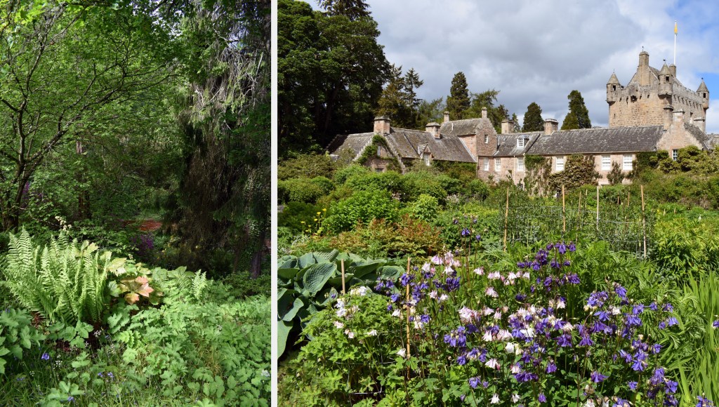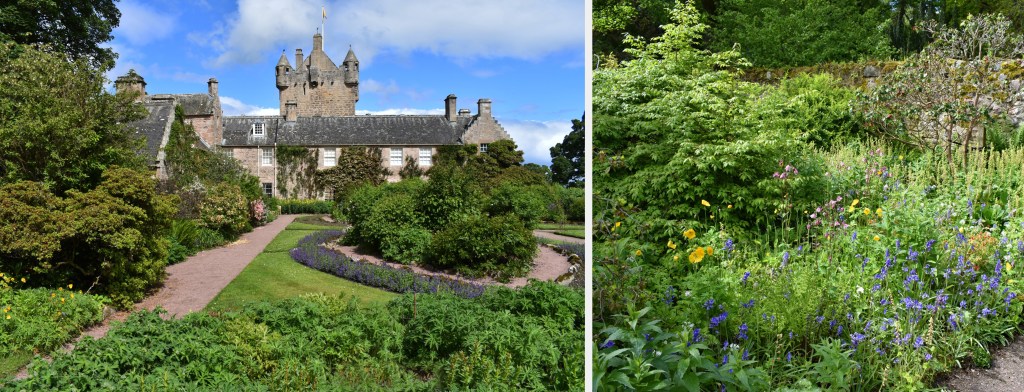 If you’ve read my Park of Monserrate blog, you’ll know that the gardens of Cawdor Castle are among my favorites. We visited in late May and the grounds were blooming with various shades of white, pink, yellow, red, and purple. The Walled Garden features a maze that depicts the Minotaur’s Labyrinth at Knossos in Crete and holds over 1,200 holly plants. At its center is a modern sculpture of the Minotaur, created by American sculptor Gregory Ryan. Numerous works of art adorn the grounds, which is included in the national list of significant gardens in Scotland. The impressive Flower Garden was added in the 18th century, and I loved the juxtaposition between the formal elements and the organic ones. The castle grounds also include a Wild Garden (added in the 1960’s) and a woodland with over 100 species of lichen.