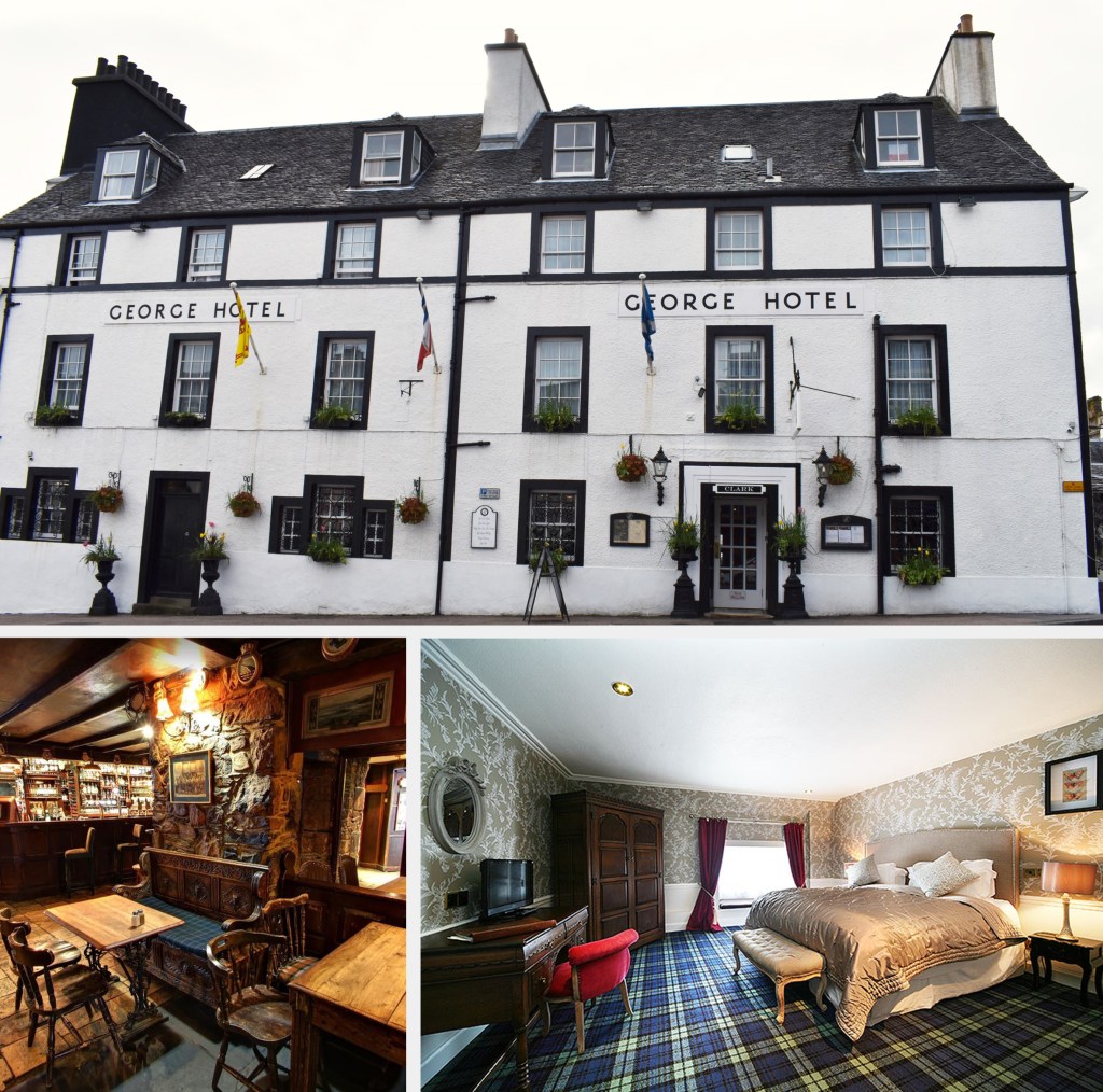 As we drove into Inveraray on Front Street, I was instantly charmed by its beauty. A grassy park along the harbor offers stunning views of Loch Fyne and the hills across. It was lightly raining, and low-hanging clouds over the loch added to the dream-like setting. Buildings with whitewashed walls line both sides of Main Street and house cafes, hotels, shops, and restaurants. The hotel we stayed at dates back to 1770 and was originally two private houses built as part of the 3rd Duke of Argyll’s redevelopment plan. In 1776, the 5th Duke of Argyll ordered that the ground floor of each house be made into temporary churches. The Clark Family bought both houses in 1860 and combined them to create a hotel. The former churches now contain the public spaces of the hotel and feature flag stone floors, open log fireplaces, and the original stone walls.