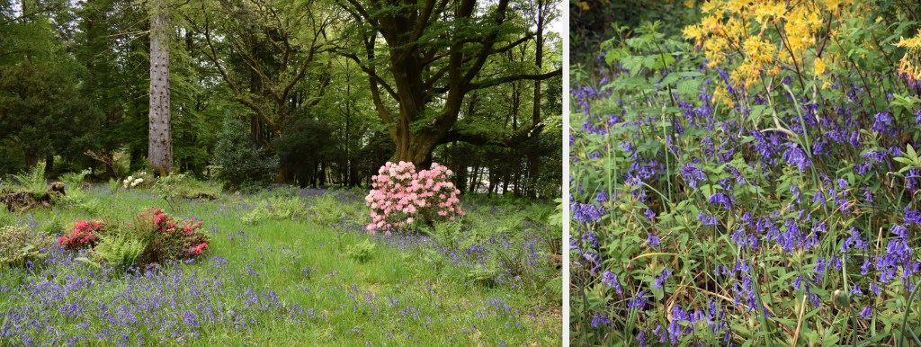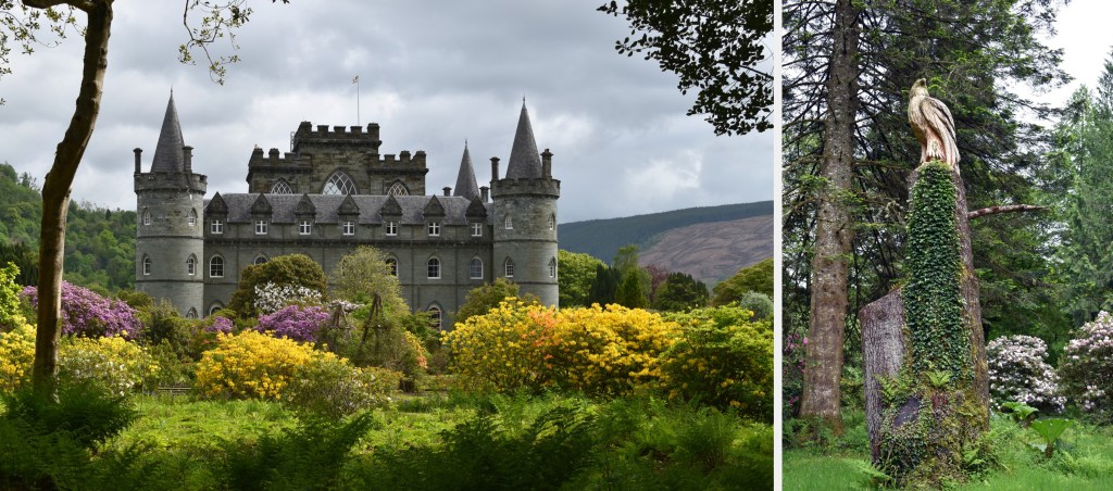 If you’ve read my other posts, you’ll know that I love castles, so I was delighted when our friends suggested a visit to Inveraray Castle. We walked from our hotel and along the way, we were treated to an amazing display of spring blooms. Bluebells covered the forest floor alongside ferns and verdant green grass. With a yearly average rainfall of 90 inches (230 centimeters) rhododendrons and azaleas flourish in Argyll and they ranged in color from white and pale pink to yellow, purple, and deep red. Since rain was predicted for the early afternoon, we decided to tour the gardens before going inside the castle.
