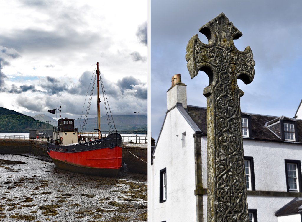 It was cloudy but dry the next morning, so I grabbed my camera and set out to explore the town. A red and black vessel in the harbor caught both my eye and my curiosity. Now named the Vital Spark, the vessel was built in 1944 by Brown’s Shipyard, Hull. Originally the VIC 72, she was a naval stores carrier until 1968 when she was motorized and used as a cargo ship. The vessel changed hands and names several times between 1972 and 2001 when she was brought to the Inveraray Maritime Museum. In 2006, she was re-registered as the Vital Spark after the fictional puffer in the Para Handy books by Neil Munro.