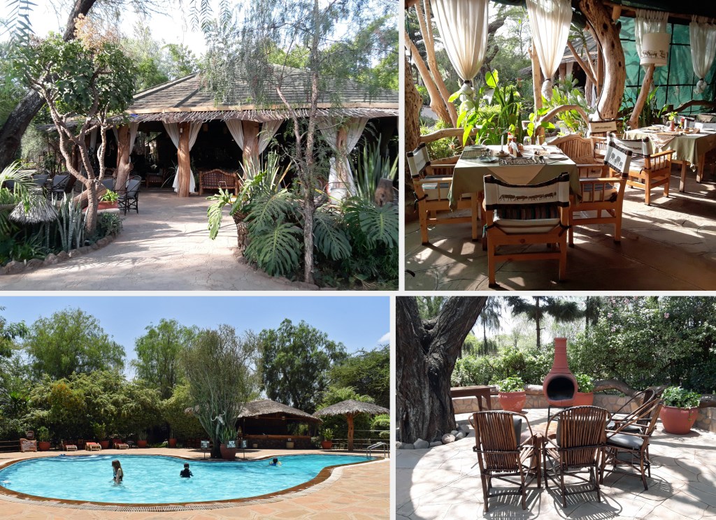 We were greeted at Kibo Safari Camp by their very welcoming staff, who offered us damp face towels and refreshing fruit juices in the lobby. After checking in, we were shown around the camp on the way to our tent. The grounds are lovely and lush with all kinds of flowering plants and native trees. The sound of numerous birds filled the air, and we could hear the Vervet Monkeys calling to each other from the trees. Our tent was much larger than I expected, with a double bed, single bed, desk, and an outside porch with a settee, tables, and two chairs. A perfect spot to relax with drinks or morning coffee!