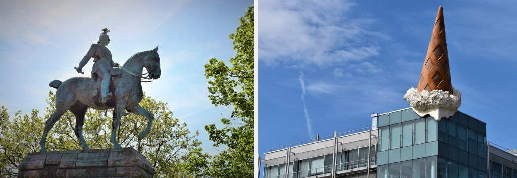 Art abounds in Cologne in both museums and public spaces. Located on the western side of the Hohenzollern bridge is a bronze equestrian statue of Kaiser Wilhelm II, King of Prussia, and the last German emperor. His reign lasted from 1888 until the revolution of 1918 when he was forced to abdicate the throne. It was constructed in 1910 by German sculptor Louis Tuaillon. The whimsical piece “Dropped Cone” adorns the roof of the shopping gallery at Neumarkt (New Market). It was created in 2001 by Pop Art couple Coosje van Bruggen and Claes Oldenburg who took their inspiration from the advertising signs of the surrounding ice cream parlors.