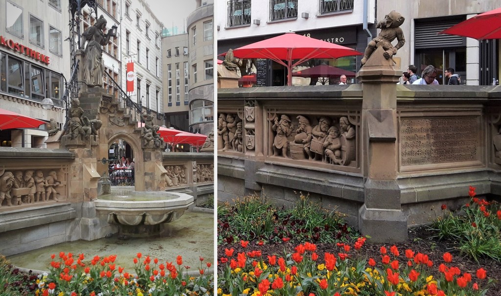 Adjacent to FRÜH, is the ornate Pixies’ Fountain (known as Heinzelmännchenbrunnen). Built in 1899, the stone fountain depicts the legend of the Pixies (Heinzelmännchen) who did the work of bakers, tailors, carpenters, and butchers during the night. Similar to the Brownies of Scotland and the Kabouters of the Netherlands, Pixies were tiny, diligent, and wore pointed caps. Working in secret, their efforts allowed the artisans of Cologne to lead a life of leisure. The centerpiece of the fountain depicts a woman holding a lantern at the top of a stairway. The woman, a curious wife of a tailor, scattered dried peas on the stairs causing the Pixies to slip and fall. Once discovered, they left forever, forcing the residents to resume their work.