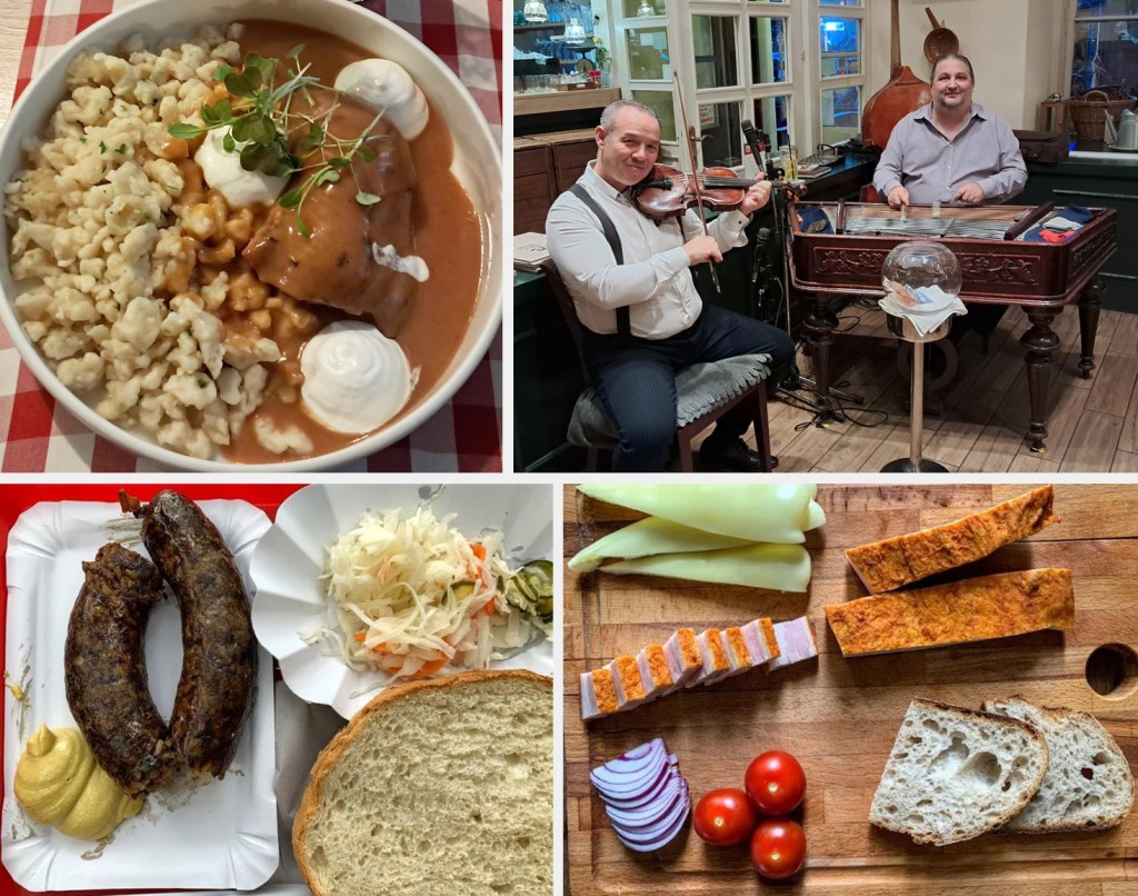 Top Row: Chicken paprikash with Dumplings, Traditional Hungarian Music with Violin and Cimbalom at PÖRC & PRÉZLI